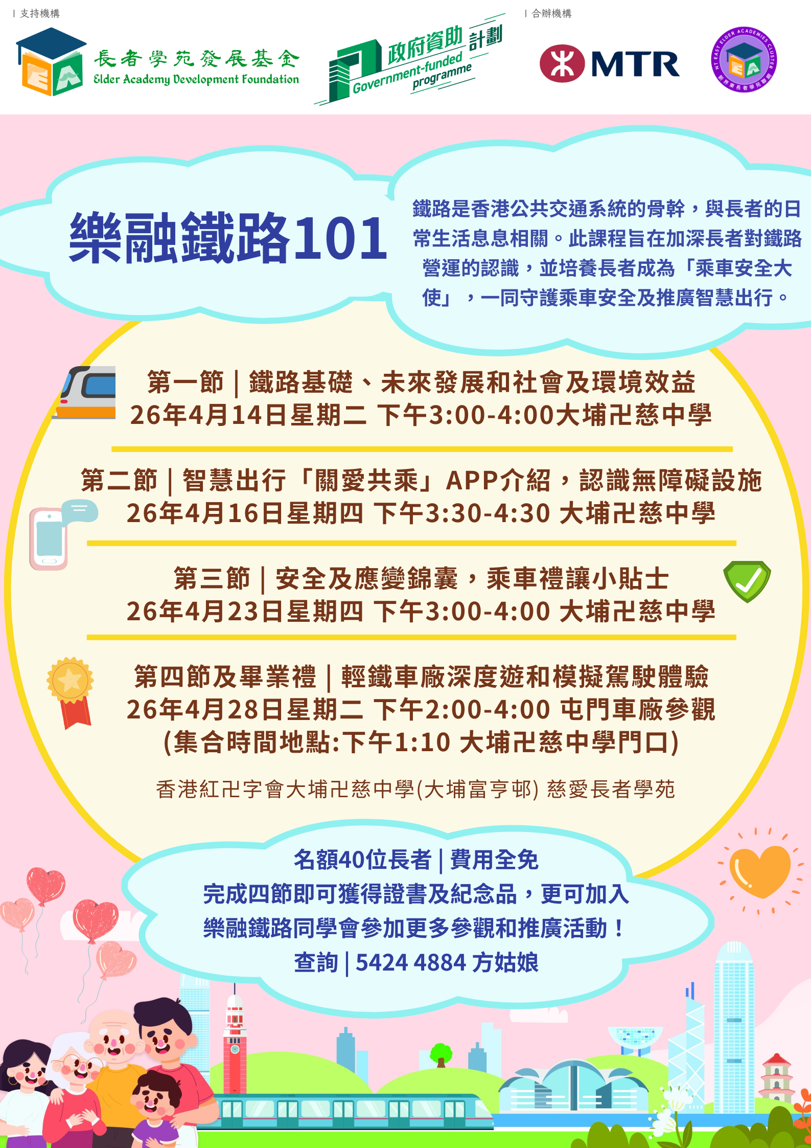 鐵路是香港公共交通系統的骨幹,與長者的日常生活息息相關。此課程旨在加深長者對鐵路營運的認識,並培養長者成為「乘車安全大使」,一同守護乘車安全及推廣智慧出行。
