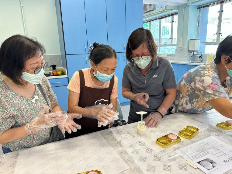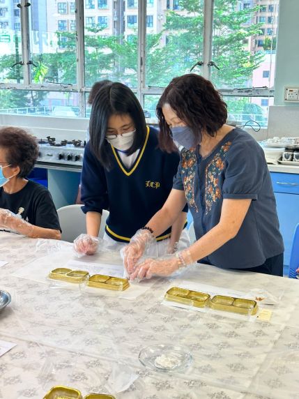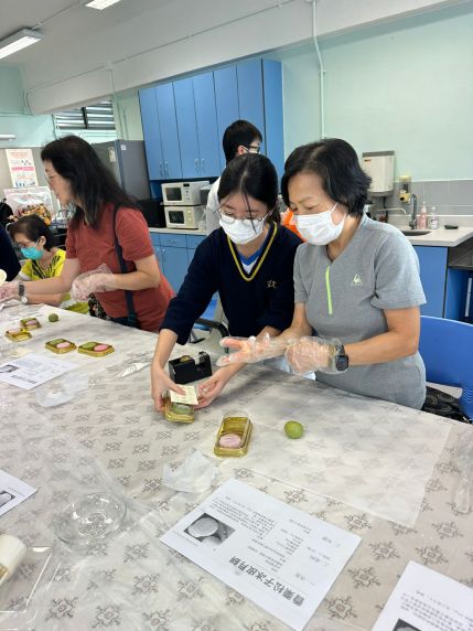 好開心大家共同創造了一個充滿愛心的場景。長者學員和學生們密切合作,一同揉捏、包裝和裝飾月餅,彼此協助,營造出一片歡樂、溫馨的氛圍。