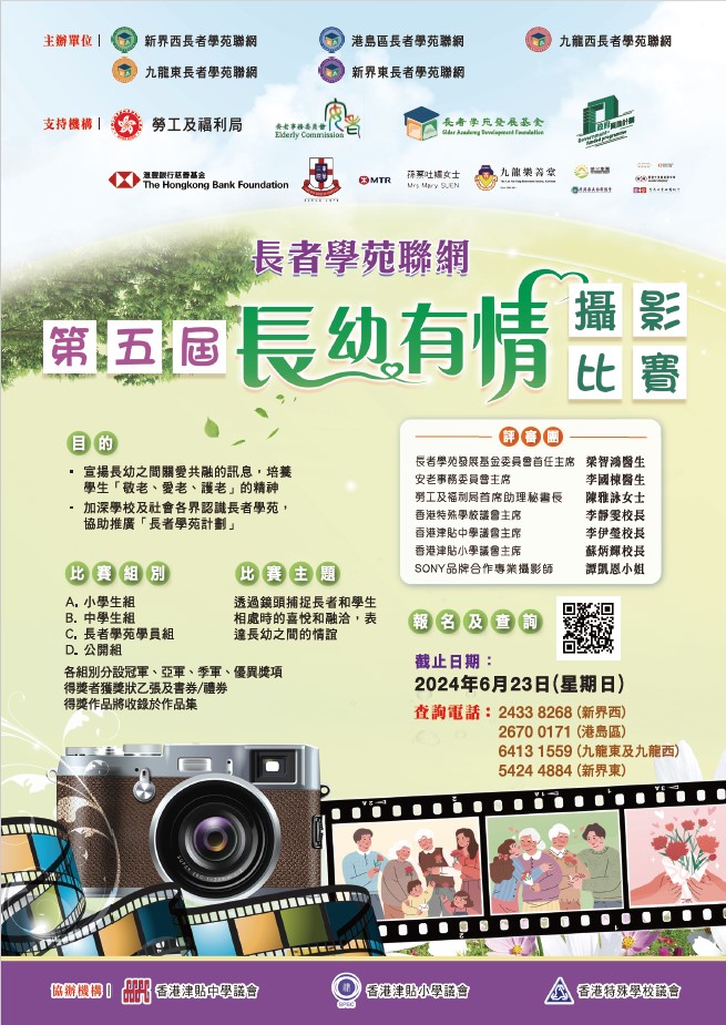 五區聯網開展第五屆「長幼有情」攝影比賽,邀請全港中、學生、全港長者學苑學員及公眾人士參賽,透過鏡頭捕捉長者和學生相處時的喜悅和融洽,宣揚長幼之間關愛共融的訊息,加強推廣「敬老護老」價值觀。