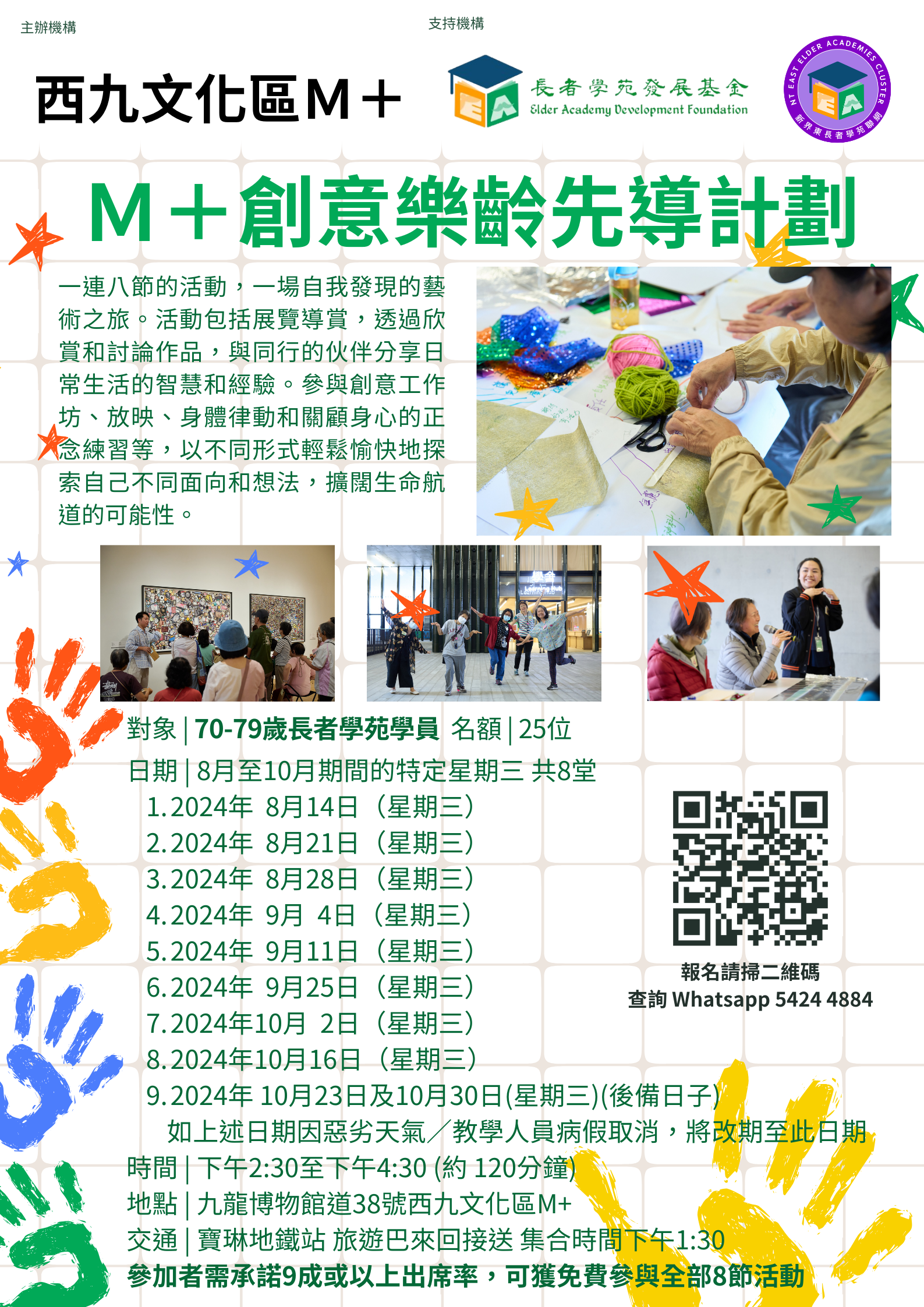 一連八節的活動,一場自我發現的藝術之旅。活動包括展覽導賞,透過欣賞和討論作品,與同行的伙伴分享日常生活的智慧和經驗。參與創意工作坊、放映、身體律動和關顧身心的正念練習等,以不同形式輕鬆愉快地探索自己不同面向和想法,擴闊生命航道的可能性。