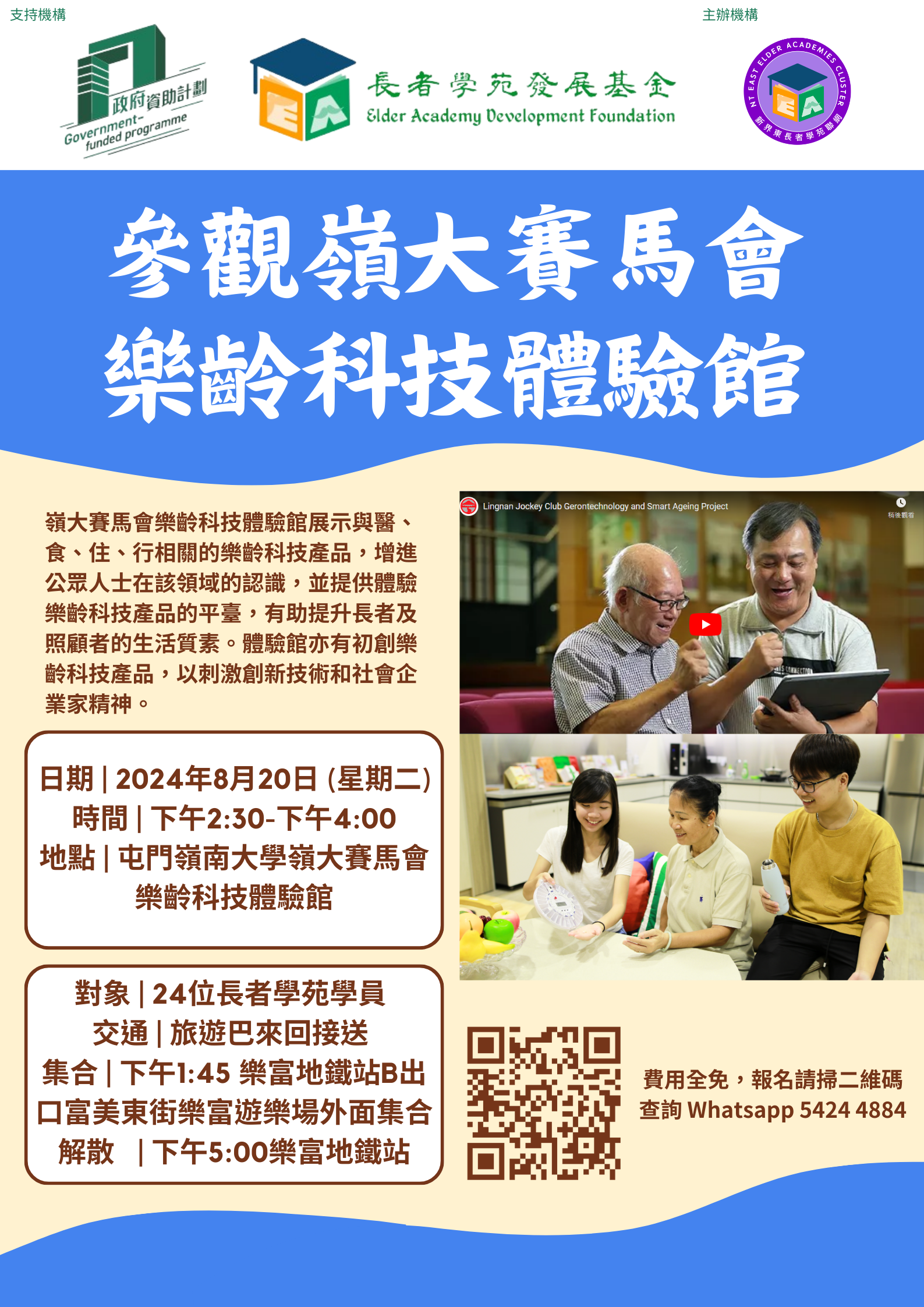 嶺大賽馬會樂齡科技體驗館展示與醫、食、住、行相關的樂齡科技產品,增進公眾人士在該領域的認識,並提供體驗樂齡科技產品的平臺,有助提升長者及照顧者的生活質素。體驗館亦有初創樂齡科技產品,以刺激創新技術和社會企業家精神。