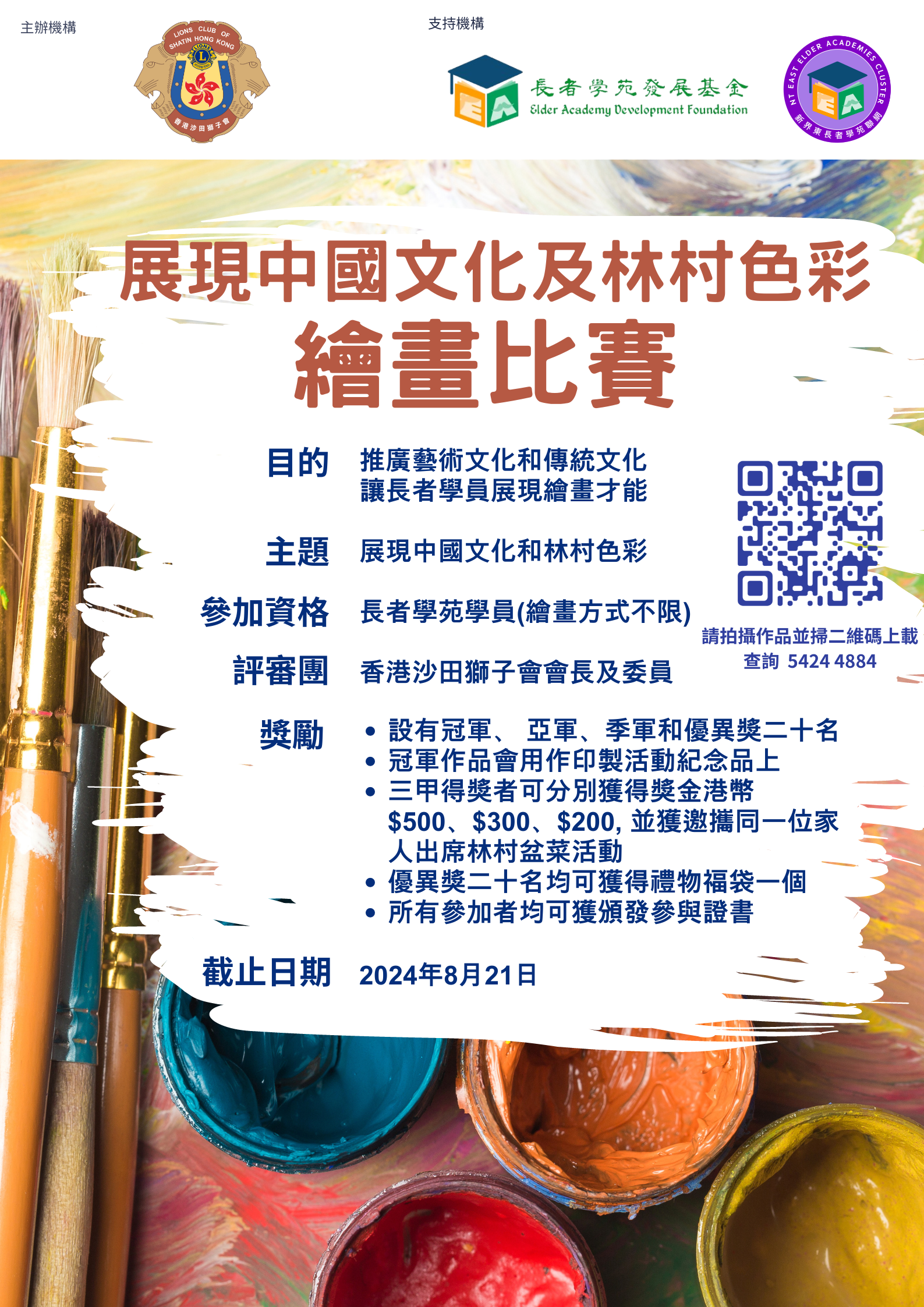 為推廣中國文化和林村特色,同時讓長者學員展現繪畫才能,現收集各位長者學員的繪畫作品參與比賽,繪畫形式不限,可以是水墨畫、粉彩畫、水彩畫、木顏色畫等等。