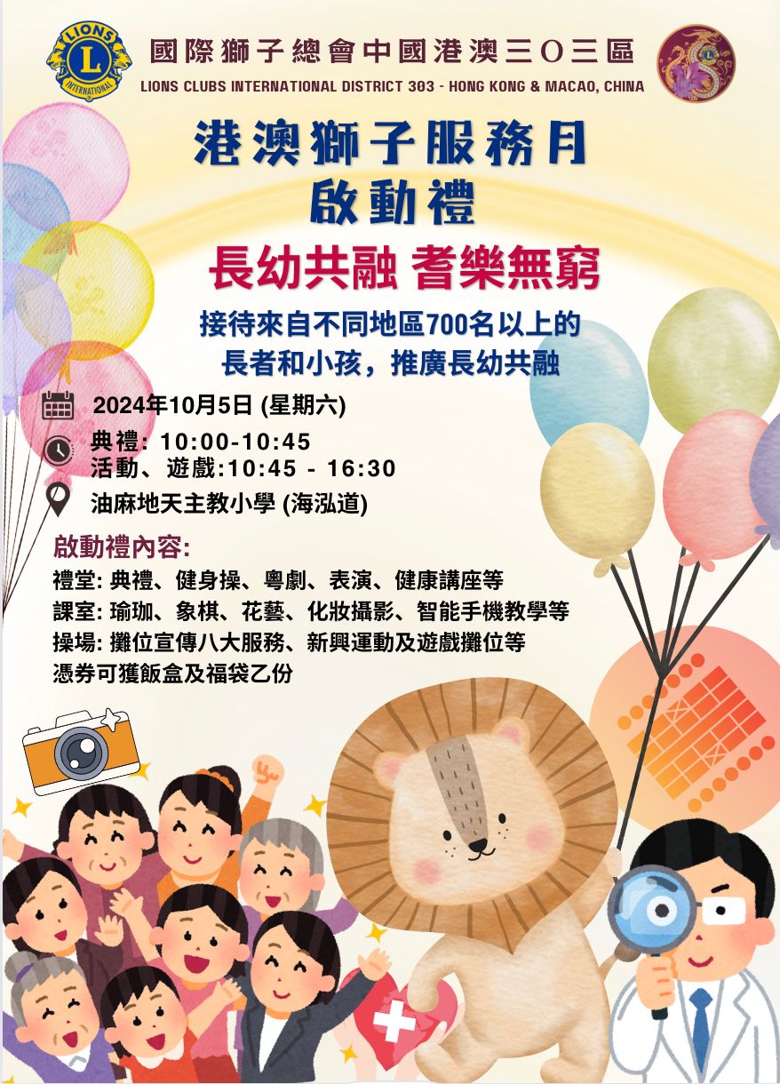 內容: 《長幼共融 耆樂無窮》啟動禮由港澳獅子會安排,其多個屬會一整天會在油麻地天主教小學不同位置提供多樣化學習活動給長者和學生參與!