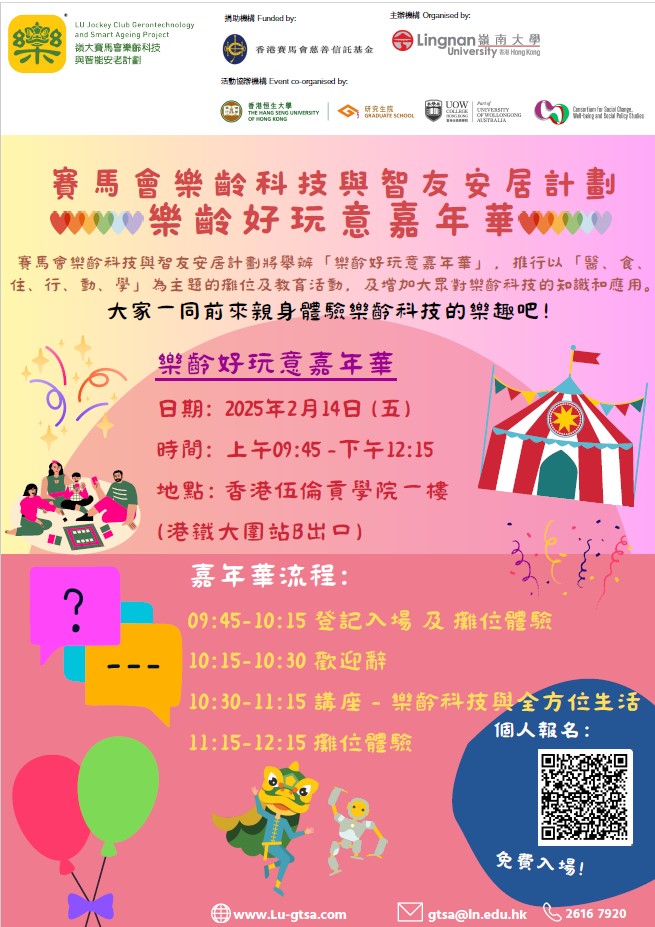 嶺南大學將聯同香港恒生大學及香港伍倫貢學院「賽馬會樂齡科技與智友安居計劃」於2025年2月14日(星期五)舉辦「樂齡好玩意嘉年華」,目標將以樂齡科技—醫、食、住、行、動、學為主題的攤位及教育活動,增加社會大眾對樂齡科技的知識和應用,達致長者友善的智能城市。