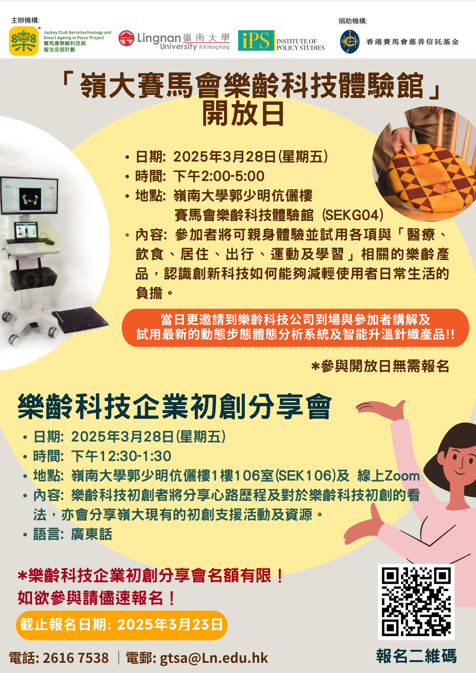 嶺南大學(下稱嶺大)誠摯邀請您參加由嶺大賽馬會樂齡科技體驗館舉辦的開放日活動。此次活動旨在讓更多長者、照顧者及公眾人士親身體驗樂齡科技,並提昇大眾對居家安老的意識,活動詳情如下: