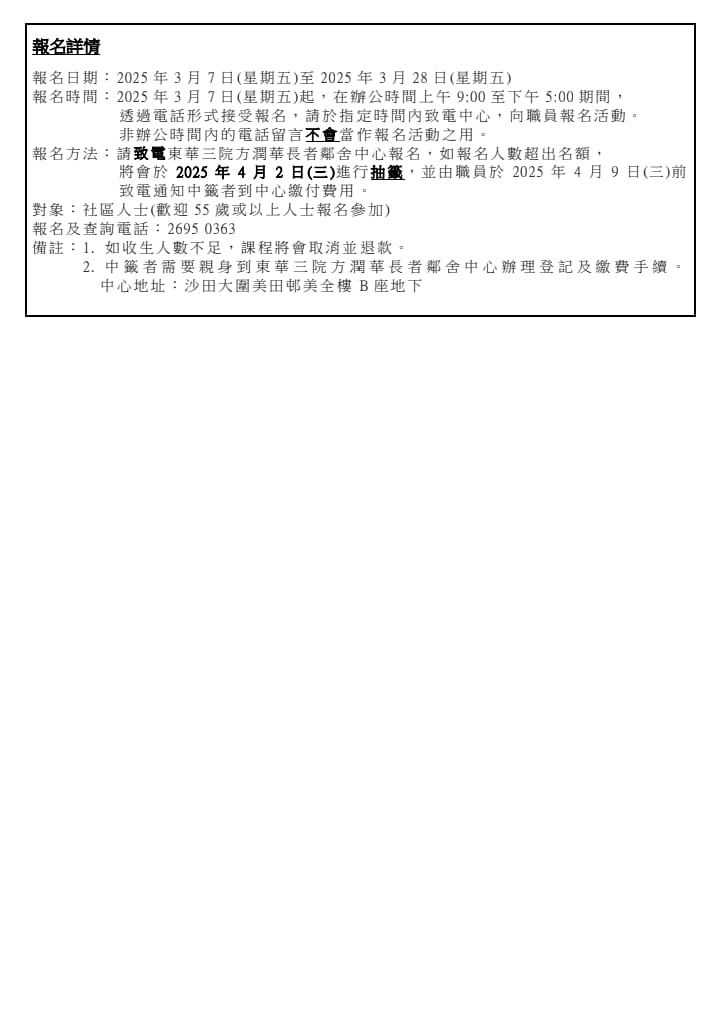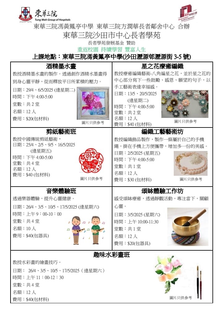 東華三院沙田市中心長者學苑開班啦!3月7日開始接受報名哦!歡迎致電東華三院方潤華長者鄰舍中心26950363報名,謝謝支持 !