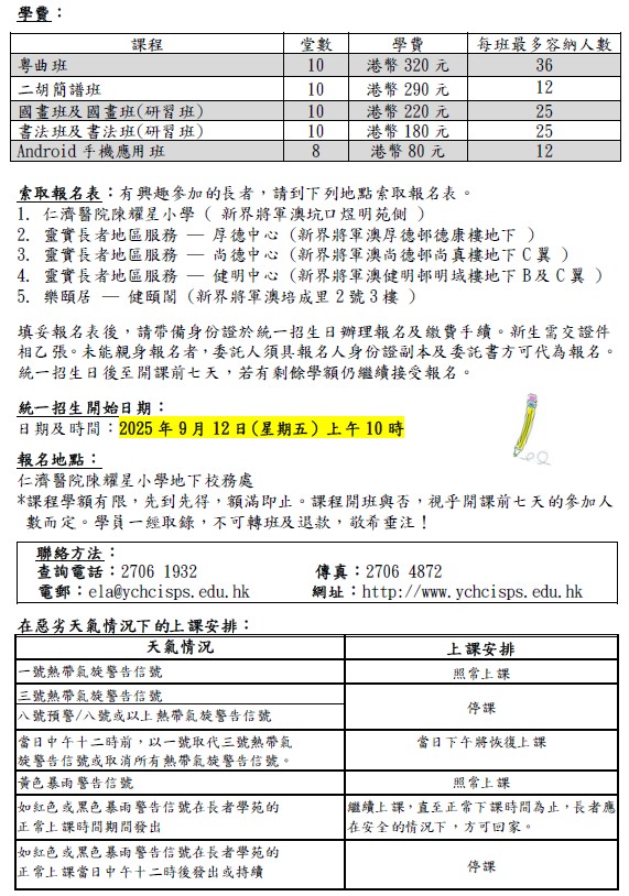 課程包括:粵曲班、二胡簡譜班、國畫班、國畫班(研習班)、書法班、書法班(研習班)、Android 手機應用班