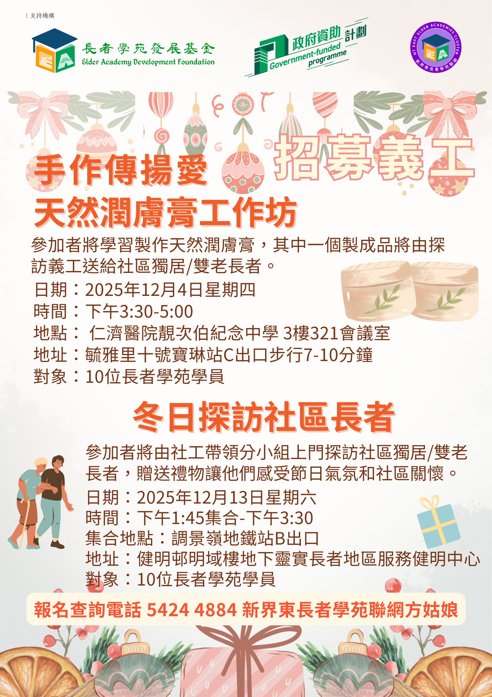 參加者將學習製作天然潤膚膏,其中一個製成品將由探訪義工送給社區獨居/雙老長者。