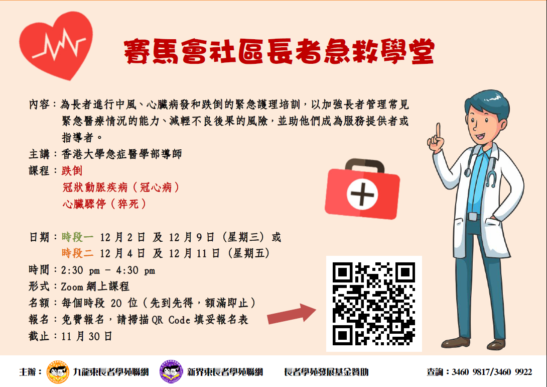 由 九龍東長者學苑聯網 及 新界東長者學苑聯網主辦的 「賽馬會社區長者急救學堂」將於 12月舉行,現正接受報名。