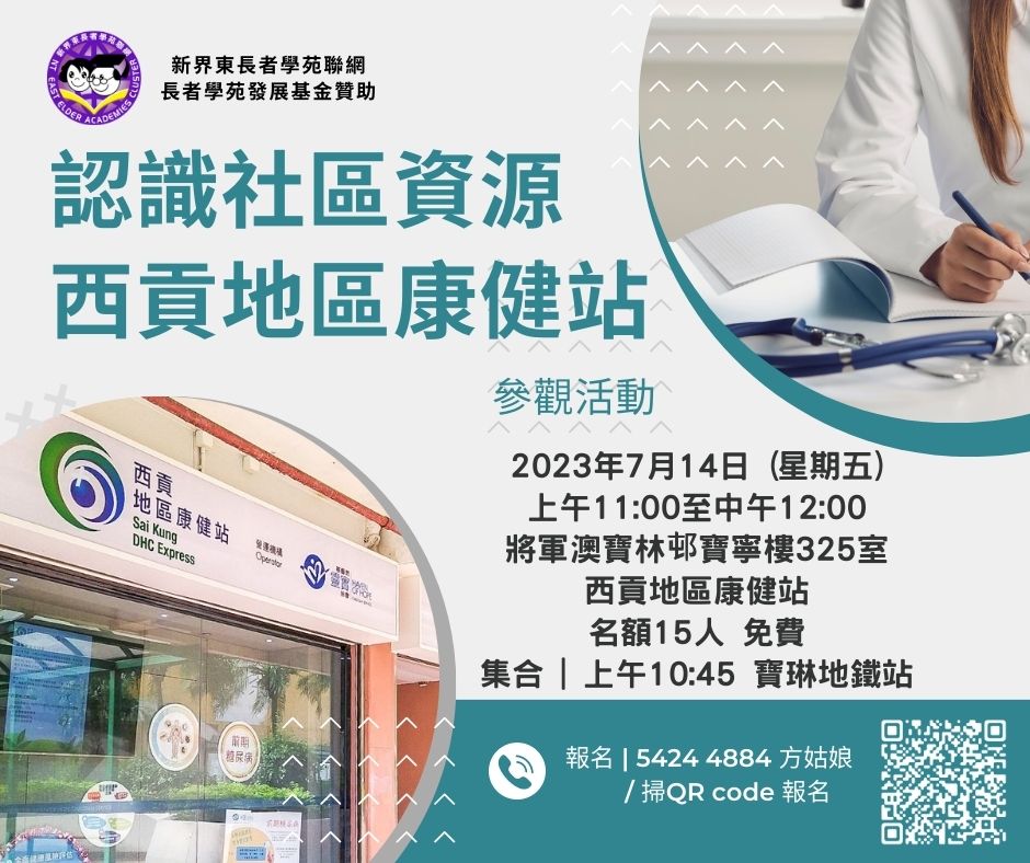 聯網今次誠意邀請各位長者學苑朋友參觀 西貢地區康健站 Sai Kung DHC Express ,讓您更深入了解社區資源和健康服務!康健站的社工會向您介紹服務特色和帶您參觀中心設施。有興趣的朋友,別忘了報名參加!