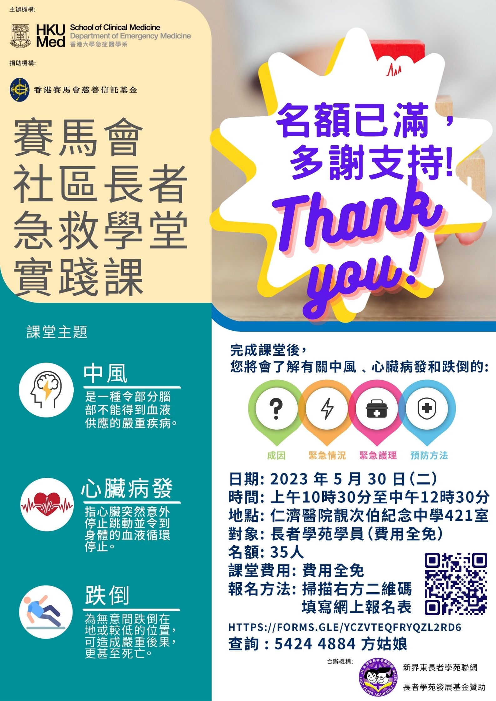 上次活動反應熱烈!聯網再次邀請了香港大學李嘉誠醫學院為大家介紹中風、心臟病發和跌倒的緊急護理培訓,以加強長者管理常見緊急醫療情況的能力、減輕不良後果的風險以及對同輩就緊急護理知識和技能教育作出指導。
