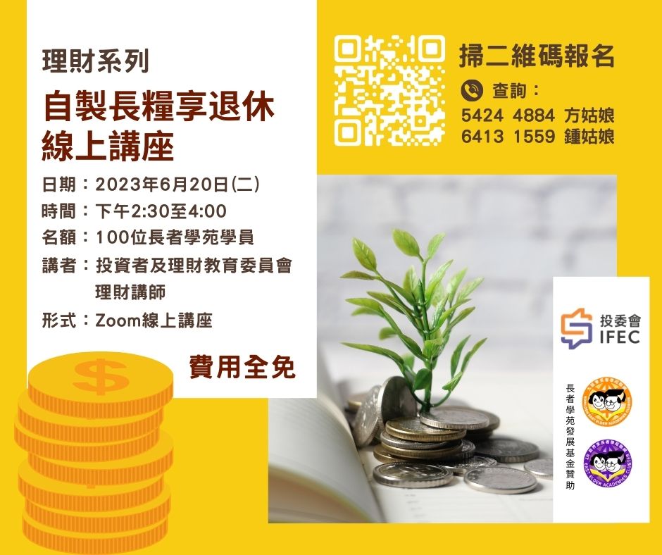 這場講座由投資者及理財教育委員會理財講師主講,讓您學習關於長者的投資理財知識,例如計算退休收入和支出、了解年金、安老按揭、長者福利金等等,並且學習如何提高的退休生活品質。