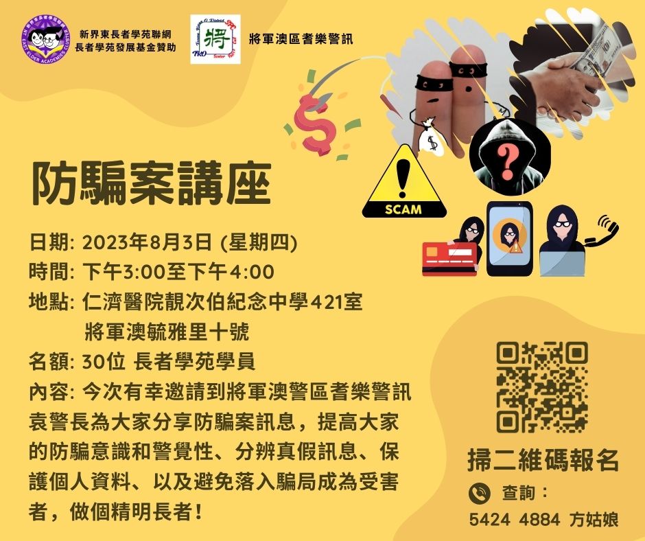 內容: 今次有幸邀請到將軍澳警區耆樂警訊袁警長為大家分享防騙案訊息,提高大家的防騙意識和警覺性、分辨真假訊息、保護個人資料、以及避免落入騙局成為受害者,做個精明長者!