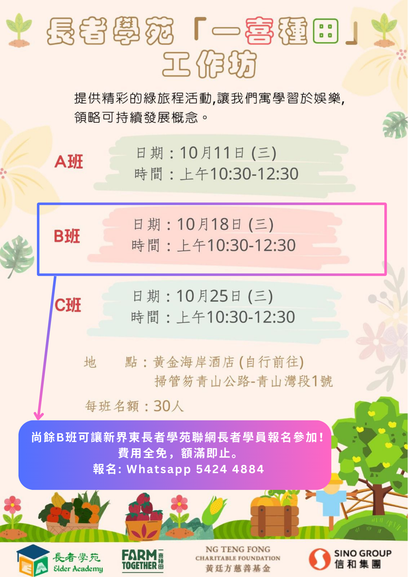 長者學苑誠摯邀請您參加我們即將舉辦的「一喜種田工作坊」活動。這將是一個綠旅程,讓您了解可持續發展概念/ESG模式、親身體驗種植樂趣的難得機會。
