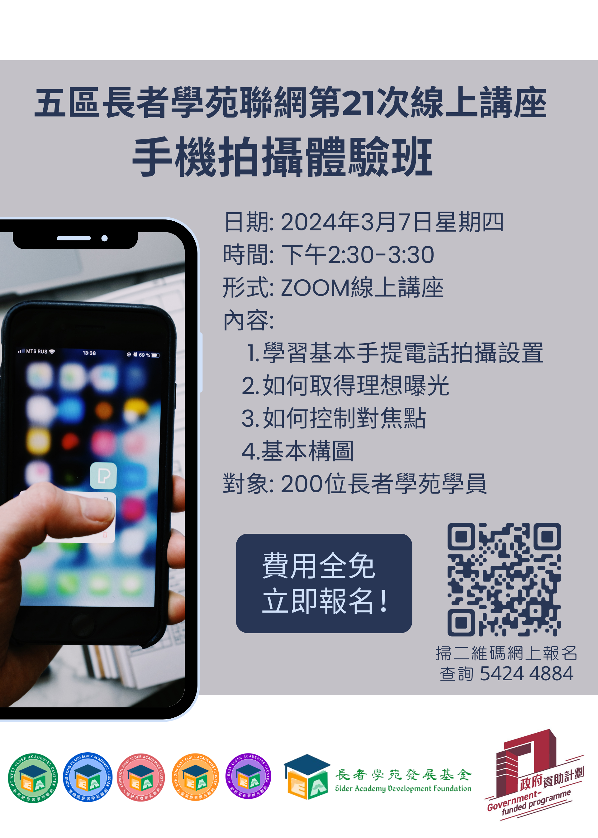 五區長者學苑聯網第21次線上講座 -「手機拍攝體驗班」