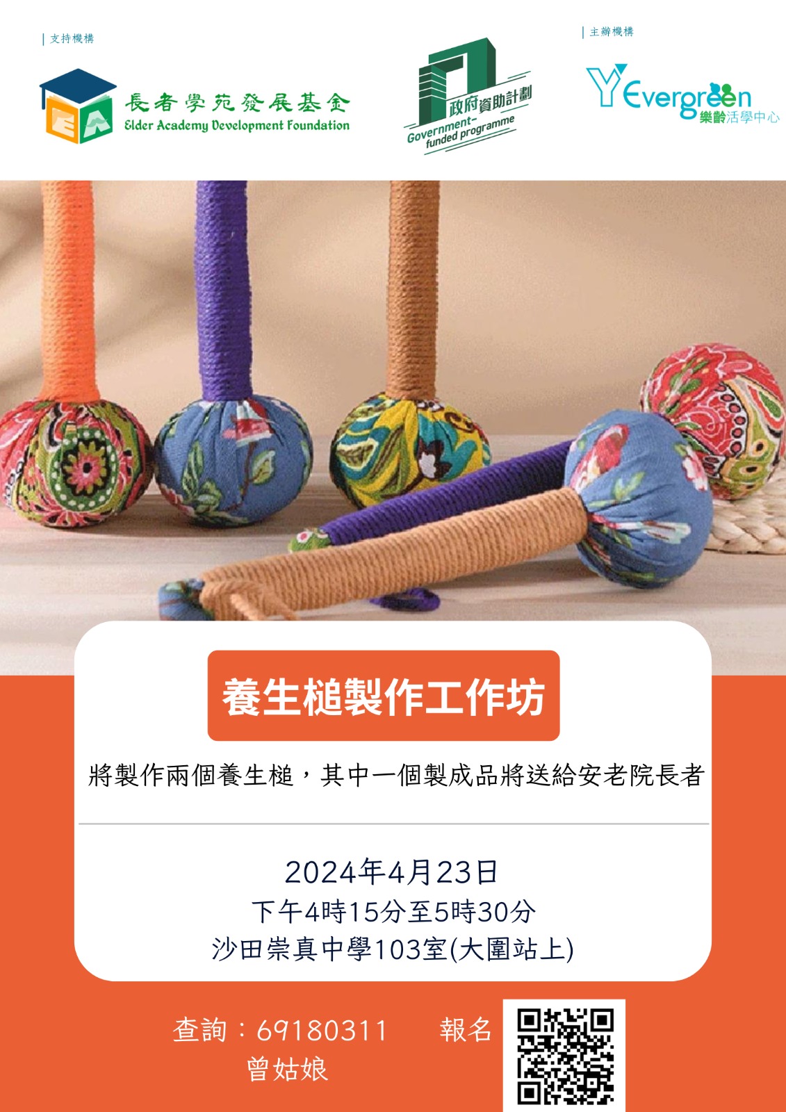 參加者將製作兩個養生槌,其中一個製成品將由探訪義工送給安老院長者傳遞關懷。