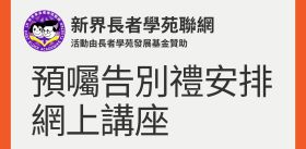 【新界東長者學苑聯網】 預囑告別禮安排網上講座 死亡不能避免,人人終會一死,不需忌諱。預早安排告別禮可以減輕親人日後的精神負擔,把愛付傳遞給留下來的人。 日期:2021年10月20日(三) 時間:下午2時30分至4時40分 講員:毋忘愛生命頌禮司 對象:100位長者及照顧者 形式:Zoom線上講座(連結將於活動前一天發放) 費用:免費 網上報名: https://forms.gle/fiHTDs1ZvBxeaMM59 截止報名:10月15日(五) 查詢:5424 4884