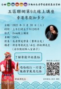 「五區聯網第9次線上講座–香港粵劇知多少」 日期︰2022 年 3 月 30 日(三) 時間︰上午11時至下午12時半 講者︰郭啟煇先生- 名伶陳劍烽入室弟子新晉粵劇武生/丑生 名額︰250人 形式︰Zoom線上講座 對象︰長者學苑學員(費用全免) 內容:介紹基本粵劇知識包括唱唸做打、行當、服飾穿戴及化妝等,讓大家了解粵劇中的奧秘 報名方法:免費報名,請填寫網上報名表 https://docs.google.com/forms/d/11scmrh9zQQ-oI3lP6yxMSNSc